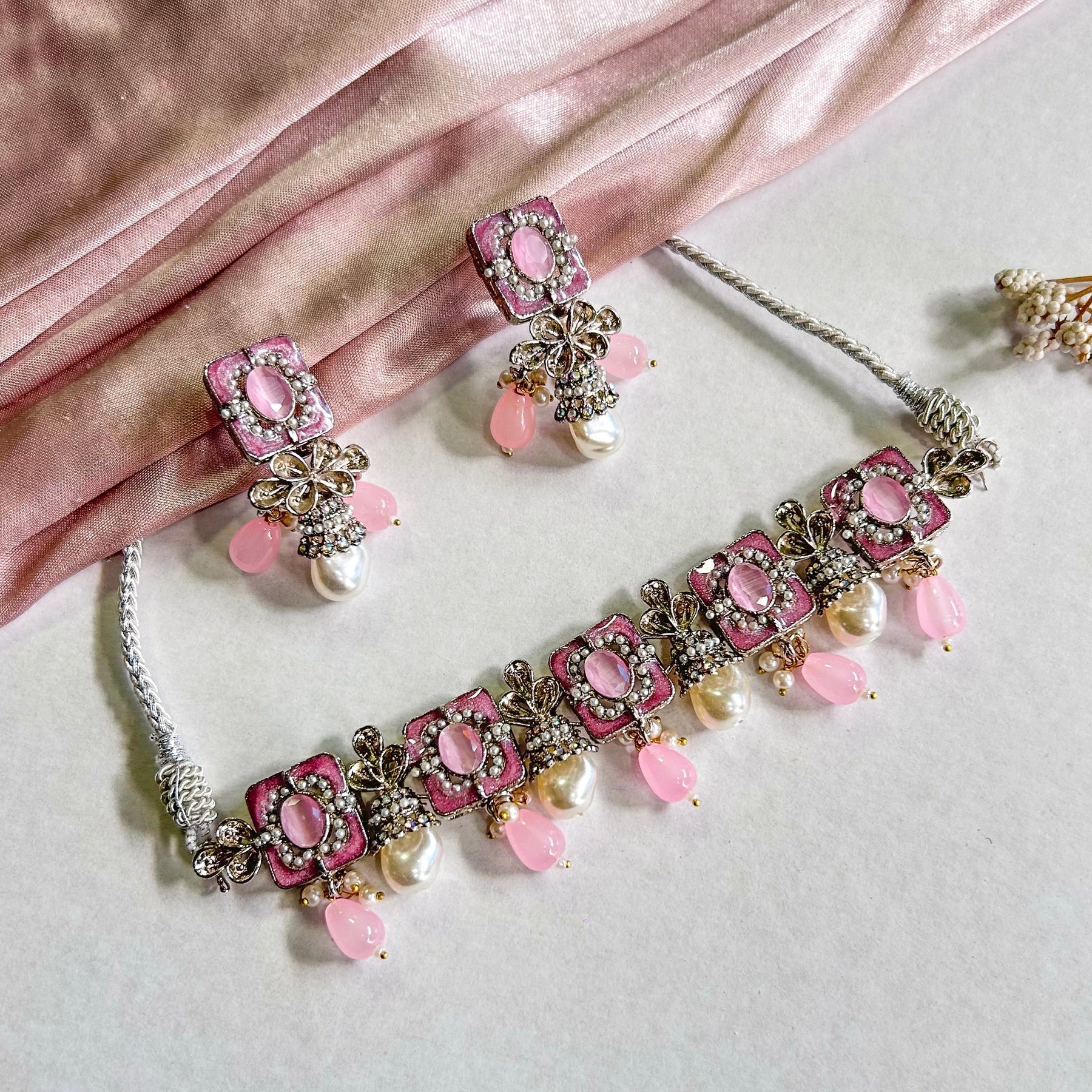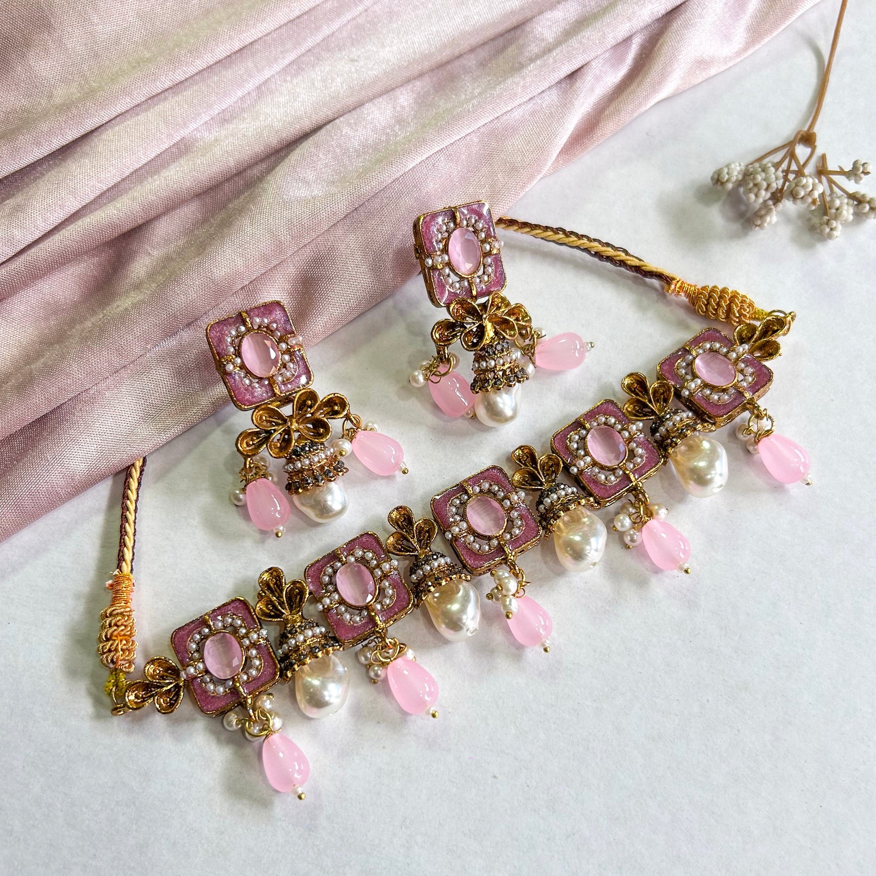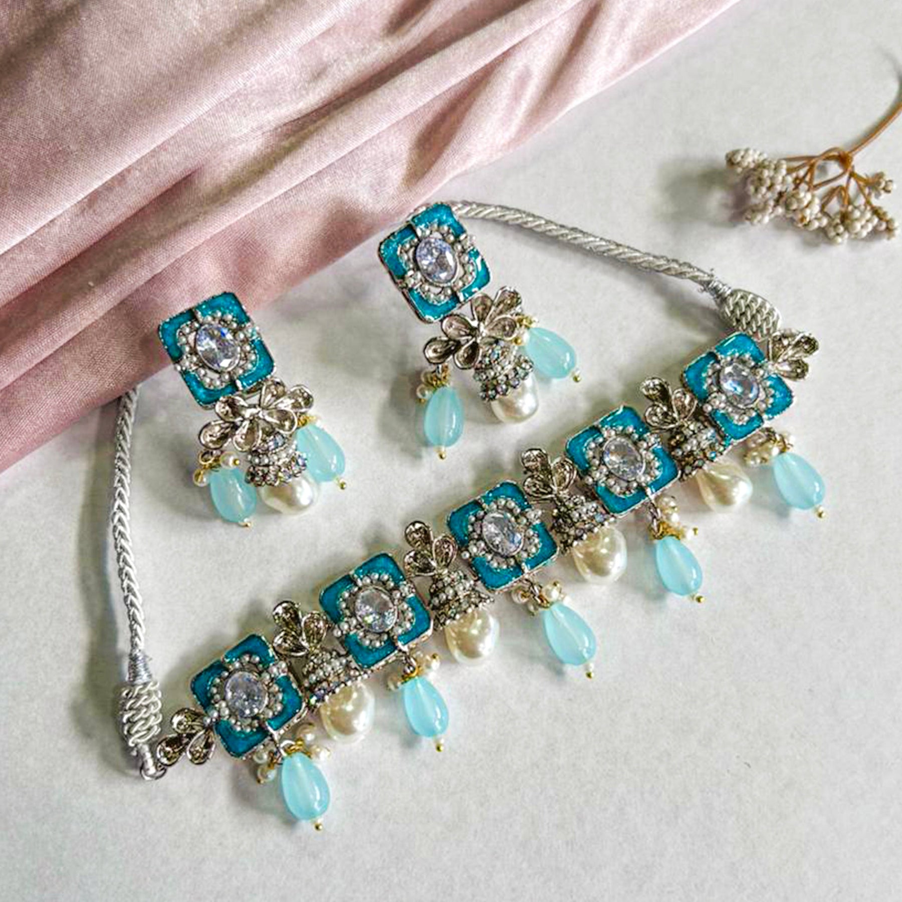 The Zewar-e-Moti Pearl and Meena Choker CS-45 is a stunning piece of jewelry that exudes elegance and sophistication. It features a delicate choker design adorned with exquisite pearls and intricate Meena work. The choker is crafted with precision and attention to detail, making it a perfect accessory for any occasion.