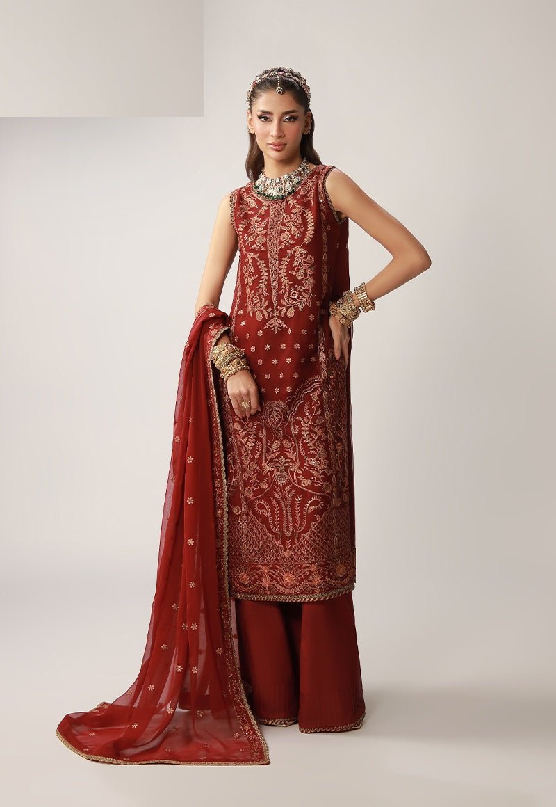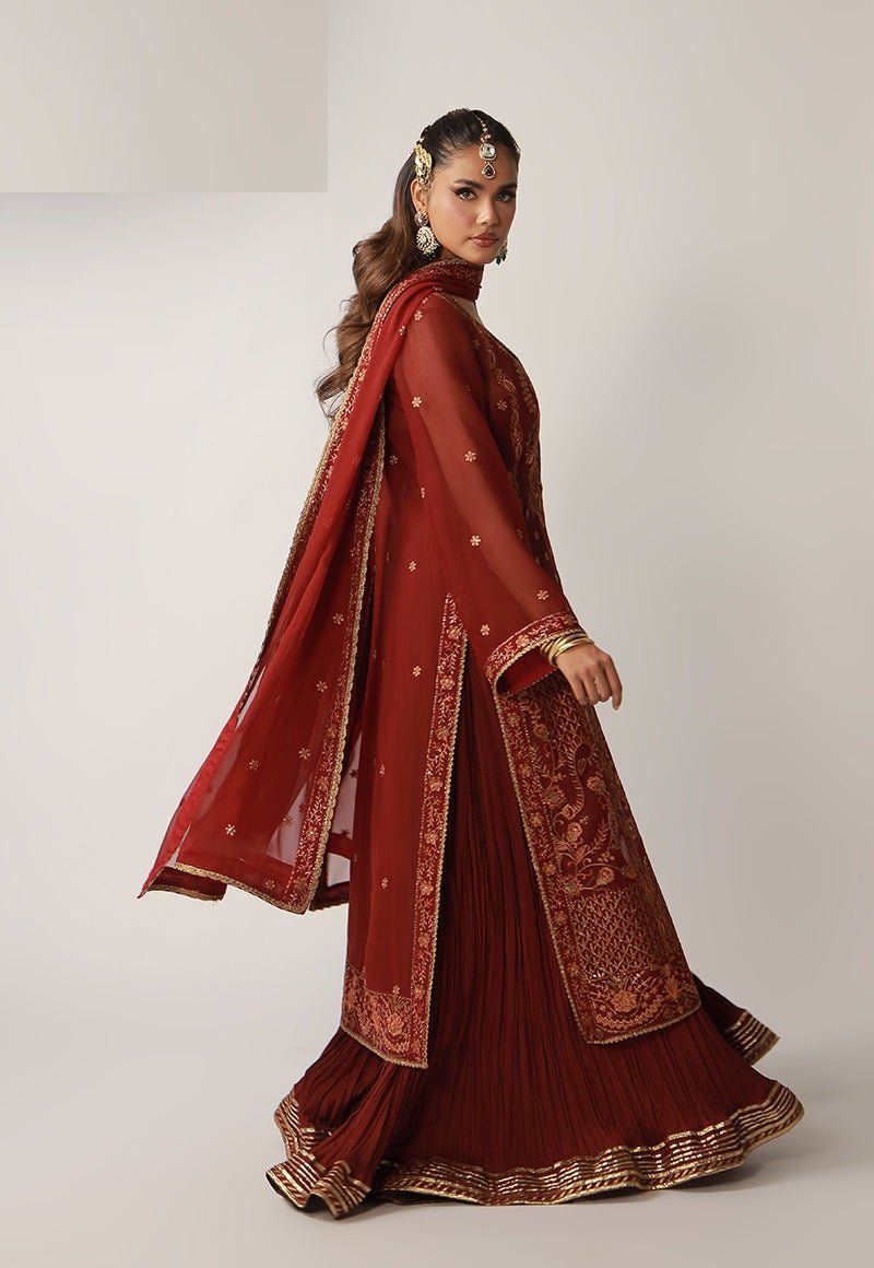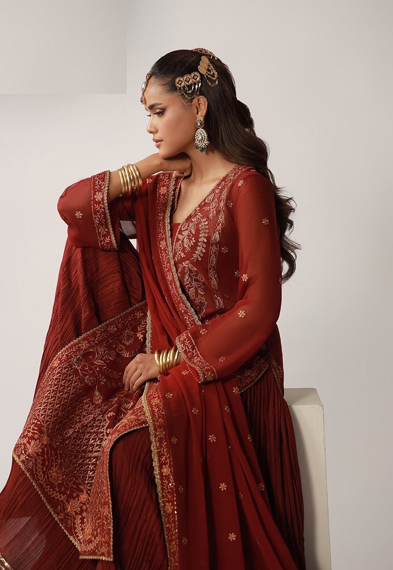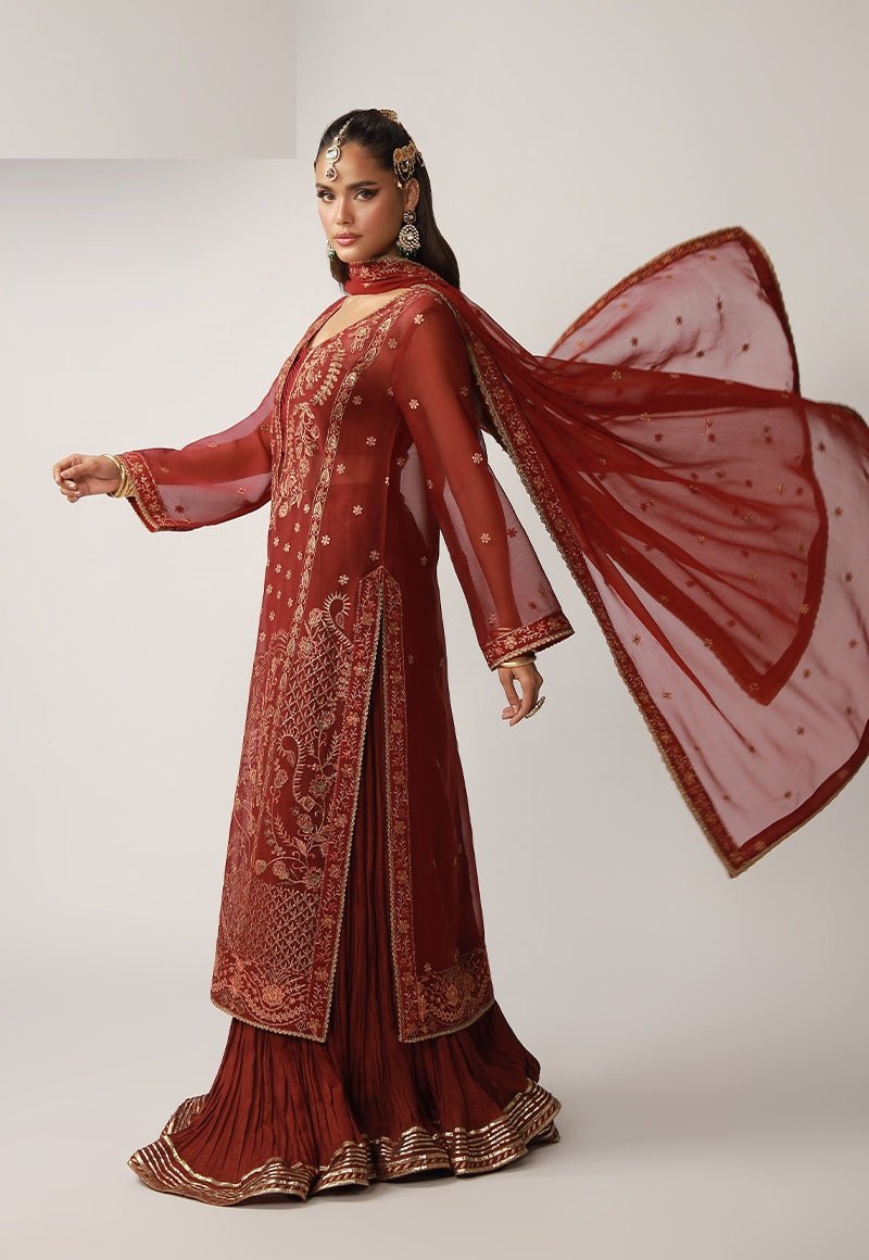 A deep maroon ensemble exudes timeless elegance, with the shirt beautifully adorned in rust threadwork and antique two-toned gold zari and sequins that catch the light with subtle radiance. Designed for versatility, the shirt can be styled as a straight shirt or tailored to your personal preference, offering effortless adaptability. Paired with an intricately embroidered dupatta, the ensemble combines classic charm with contemporary freedom, perfect for festive or celebratory occasions.