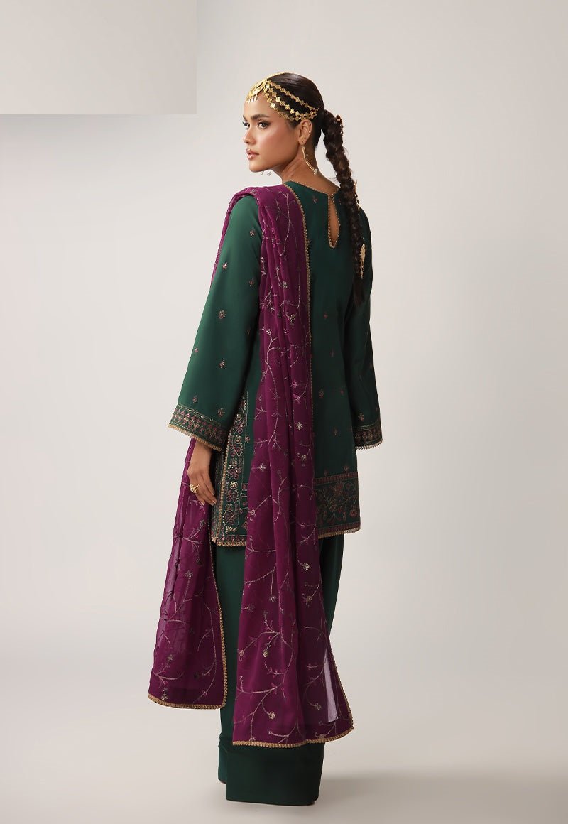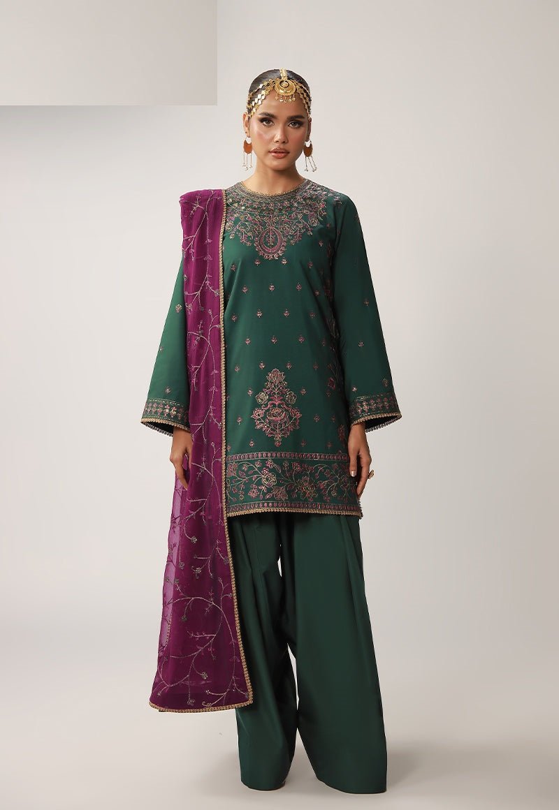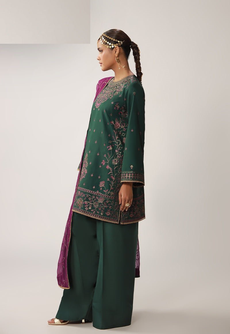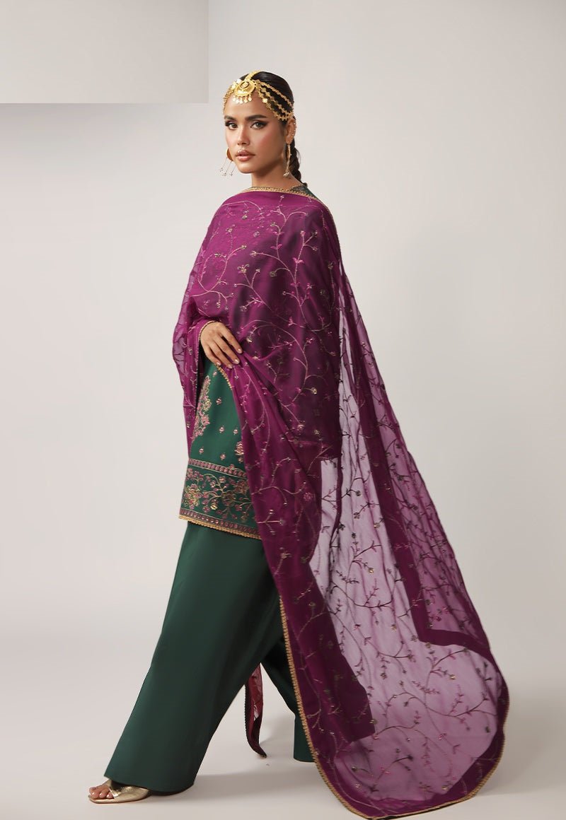 A deep green ensemble that radiates understated grandeur, its rich tone elevated by exquisite work. The shirt is adorned with antique gold zari and matte gold cupped sequins that lend a muted yet mesmerizing shimmer, while purplish-magenta and dark threadwork add depth and contrast to the intricate detailing. Designed with versatility in mind, it can be styled as either a long or short shirt, allowing you to tailor the silhouette to your personal flair. Paired with a contrasting magenta dupatta featuring an elegantly embroidered jaal, the look comes together as a striking fusion of tradition, versatility, and refined charm.