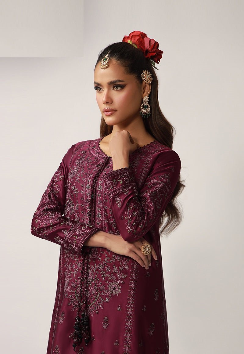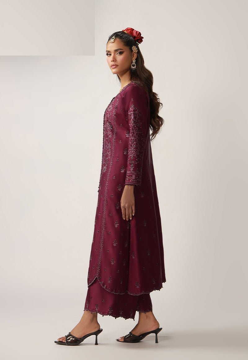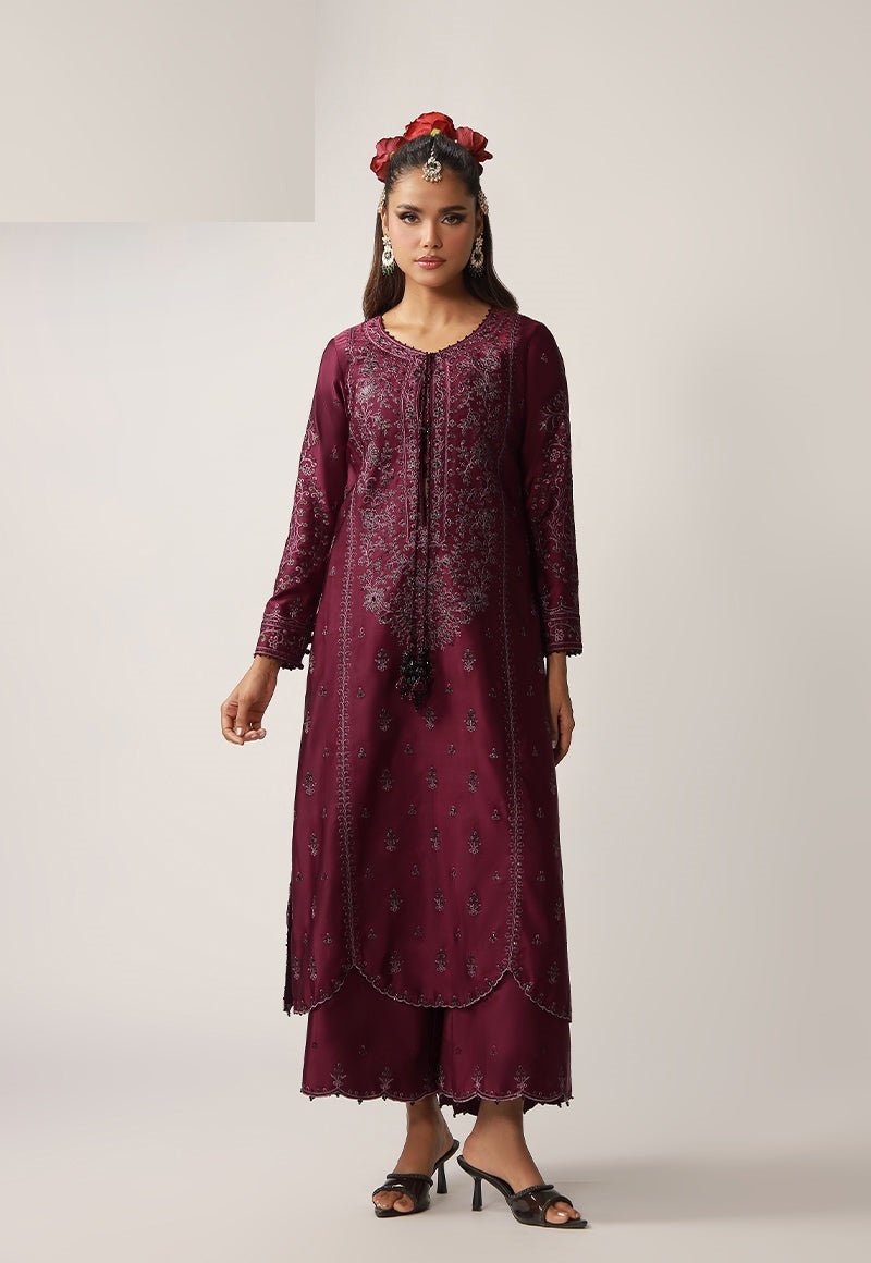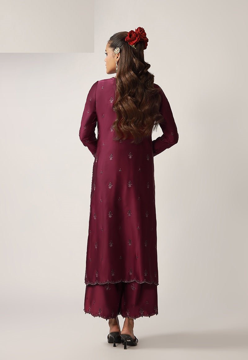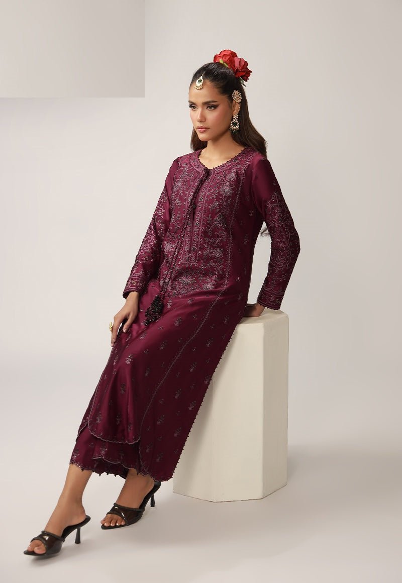 A rich maroon hue drapes this charmeuse silk ensemble in a luxurious, silky sheen. The shirt is adorned with glimmering black cupped sequins, their subtle sparkle beautifully balanced by delicate threadwork in dusty pink, sage green, and maroon, a tapestry of tones that adds depth and dimension to every detail. A scalloped hemline graces the shirt, lending a refined feminine finish. Paired with intricately embroidered trousers that echo the artistry above, the look comes together as a harmonious blend of elegance and contemporary grace, perfect for occasions that call for understated sophistication.