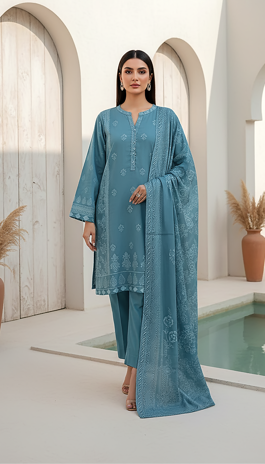 2. Unstitched suits include fabric and patches only as mentioned in the description above (not Embellishments e.g. tassels etc).